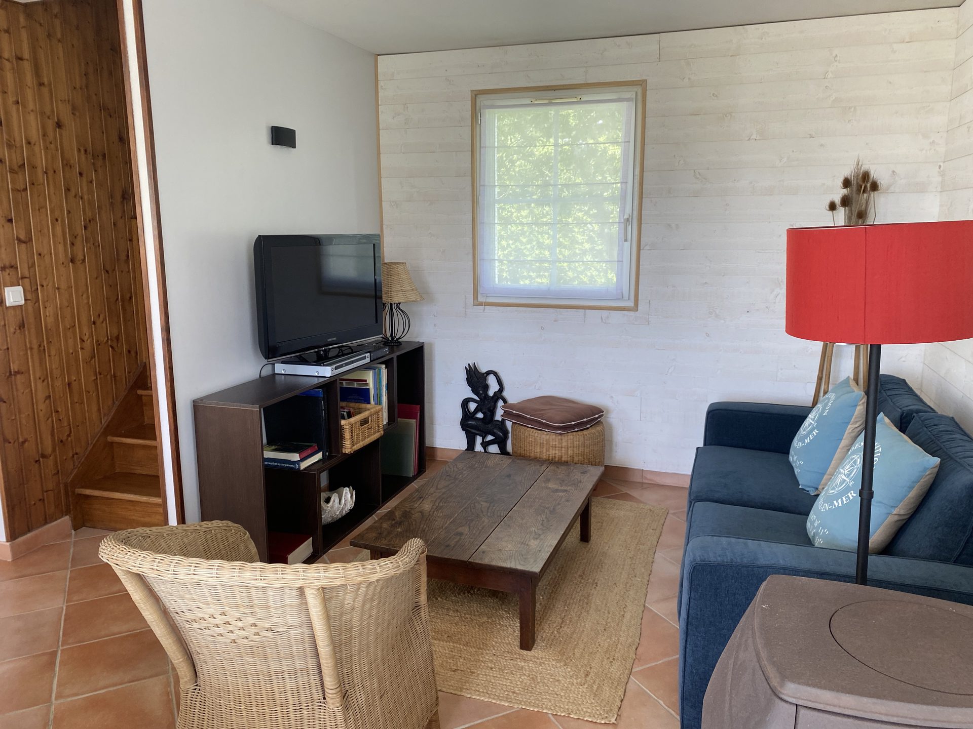 - Une pièce principale (50 M²) de séjour et salle à manger avec table, chaises, canapé, poêle à bois et télévision.