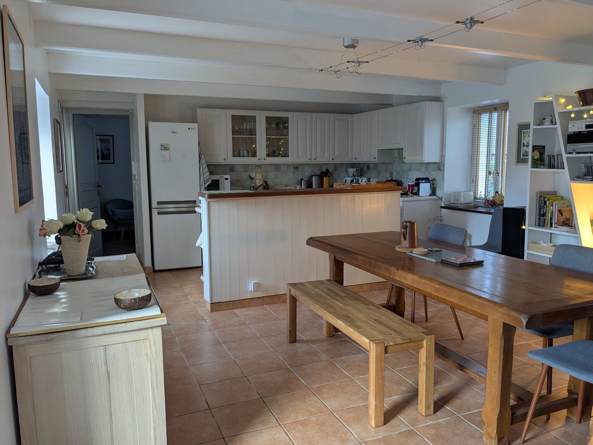 - Une cuisine américaine entièrement équipée avec réfrigérateur-congélateur, cuisinière gaz, four traditionnel, micro ondes, lave-vaisselle, caftière filtre et nespresso.