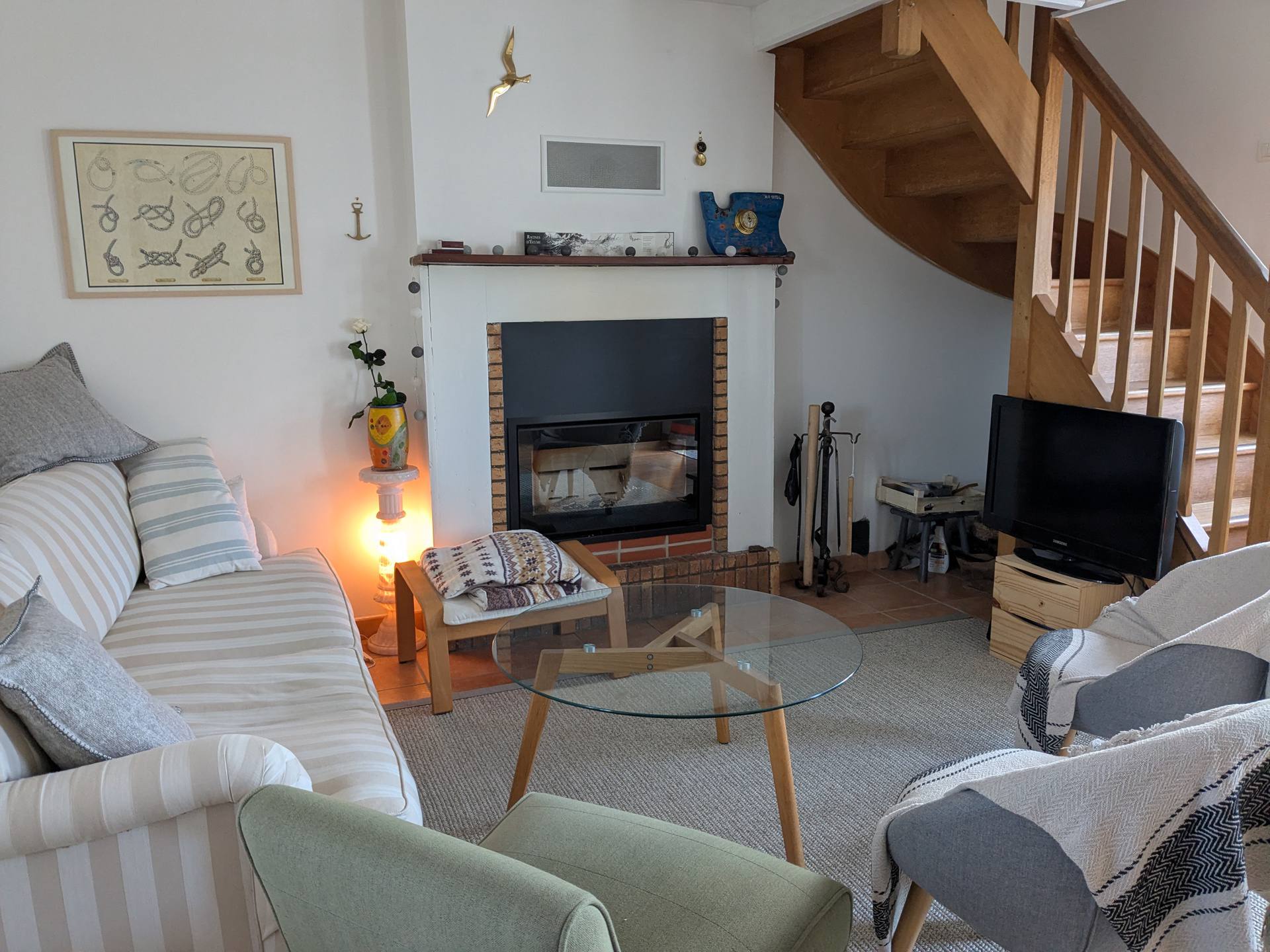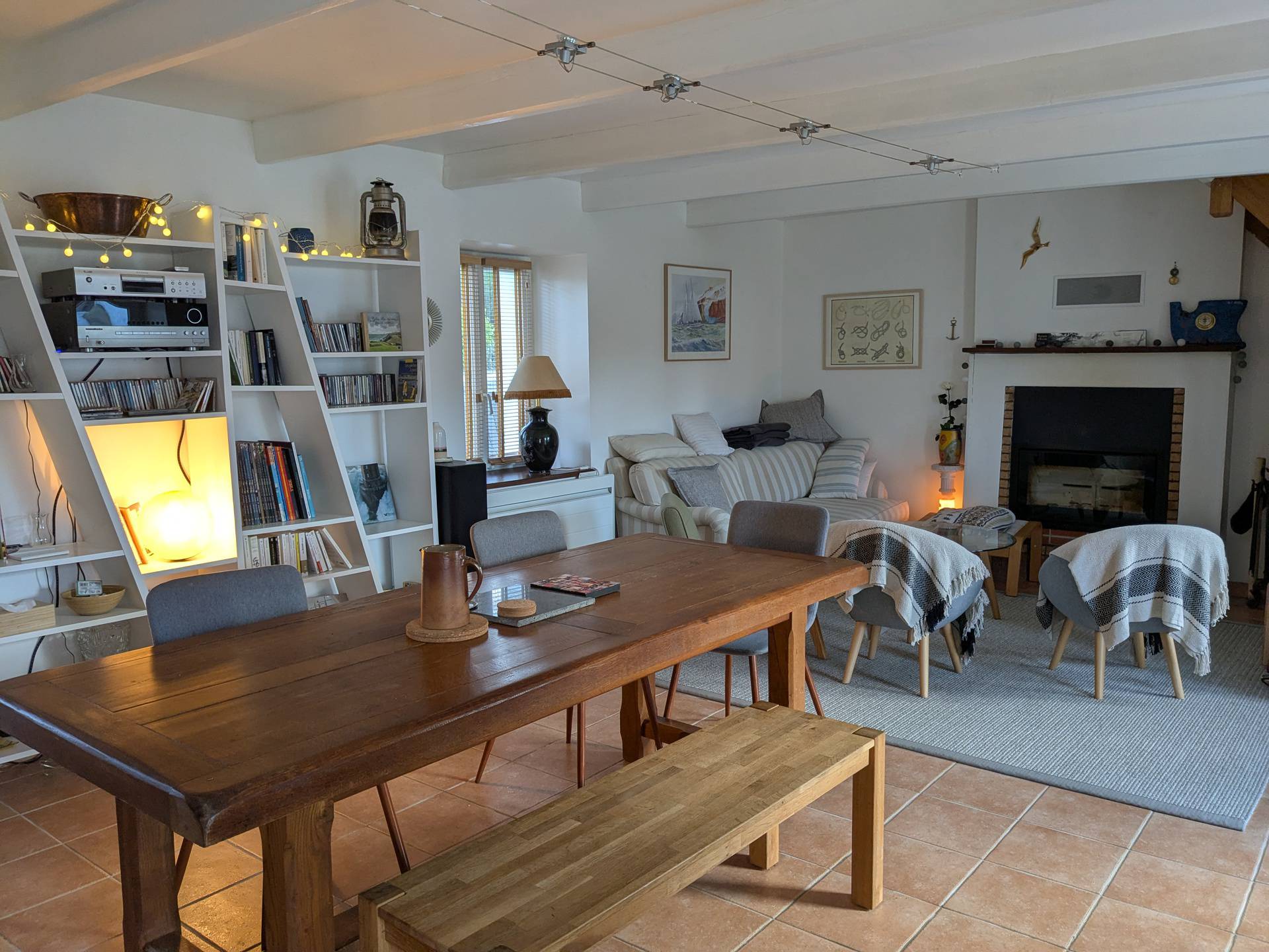 - Une pièce de séjour /cuisine (40M²) avec télévision chaîne hi-fi, wifi, table et bancs, canapé et fauteuils.
