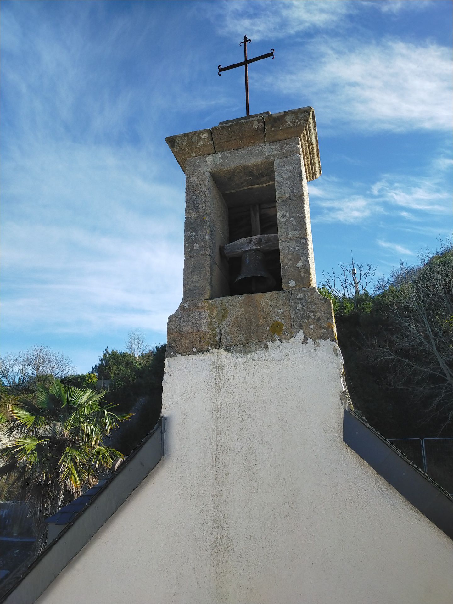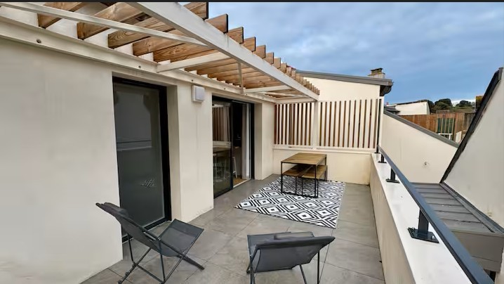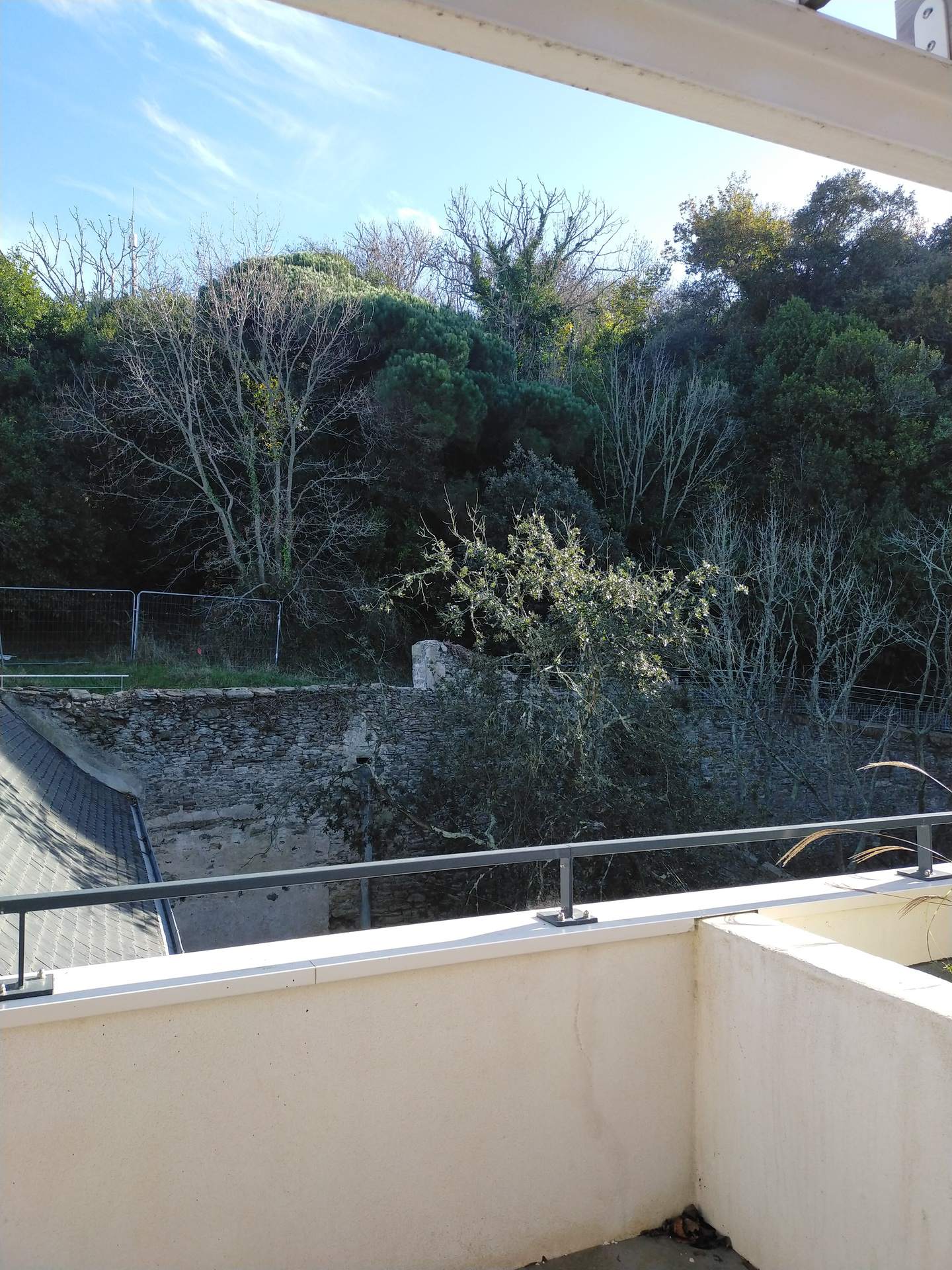 L'appartement dispose d'une terrasse de 18m² aménagée avec table et bancs, parasol donnant sur une ancienne chapelle et le bois. Pas de réseau wifi/téléphone accessibles pour le moment.