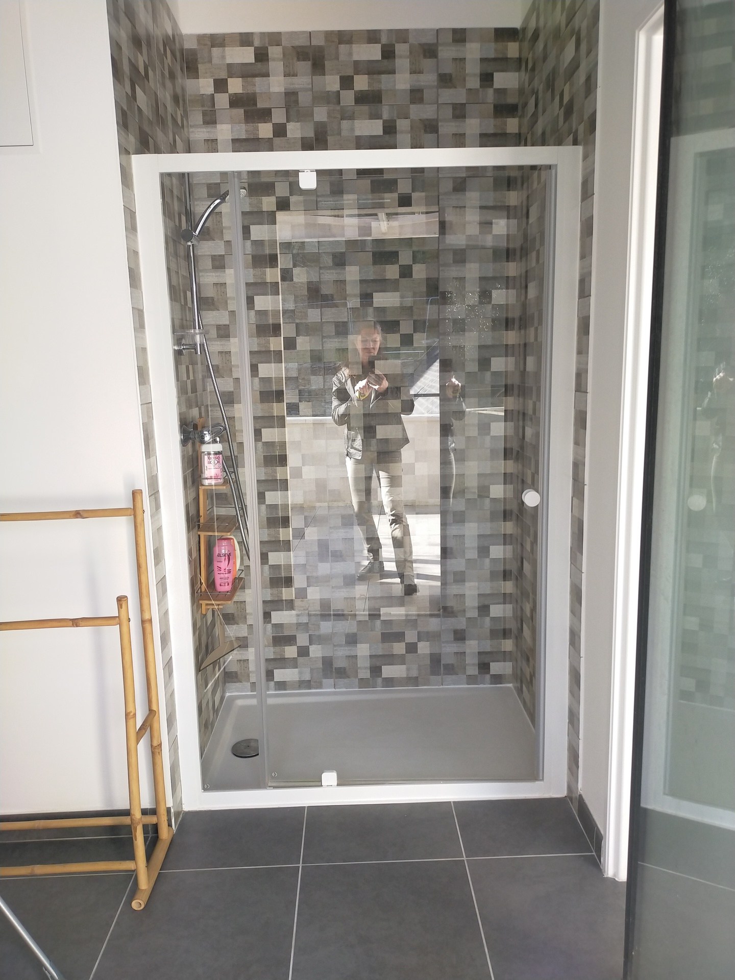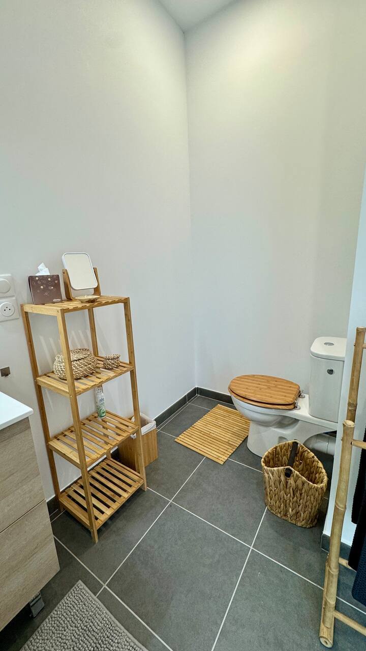 - Une salle d'eau (7m²) avec douche large, meuble vasque, WC.